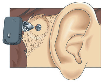 骨传导助听器没有所谓“耳机”或者耳塞,取而代之的是一个能够产生振动信号的震荡器,将震荡器压紧在耳后凸起的乳突骨上,震荡器的震动会引起颅骨的震荡并将信号越过外耳与中耳——骨传导助听器的优势正在于此——直接传递到内耳。